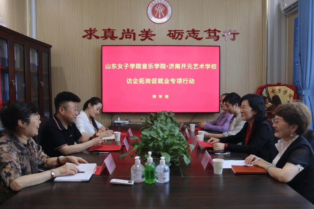 为落实教育部及山东省教育厅关于开展全国高校书记校长访企拓岗促就业专项行动要求,加快健全毕业生市场化社会化就业创业工作机制,千方百计开拓更多就业创业岗位和机会,深入落实就业工作“一把手”工程,结合我院2022届毕业生当下就业情况及形势,2022年5月25日下午,学院联合济南开元艺术学校开展“访企拓岗促就业”专项行动交流会,山东女子学院副校长刘恩允、音乐学院院长宋小霞、声乐教研室主任刘平、舞蹈教研室主任朱济光、辅导员李梅华、济南开元艺术学校校长于洋、常务校长王淑萍参加此次会议。