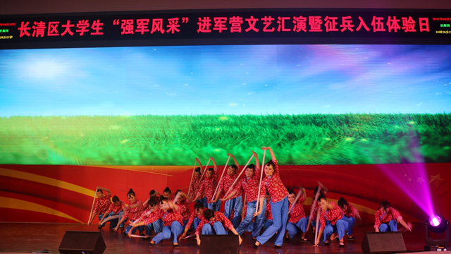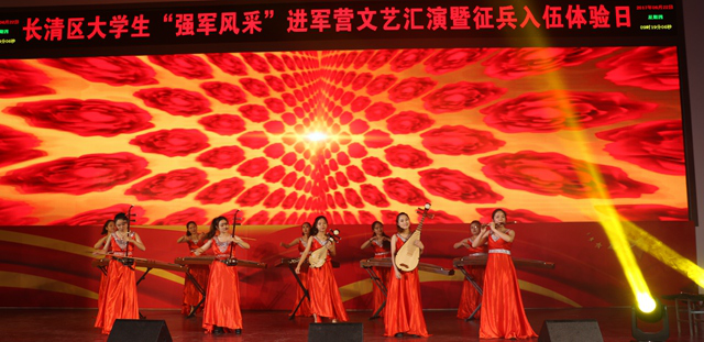 6月23日上午,由长清区武装部和驻长清某部队联合举办的以“强军路上斗志扬•无悔青春献国防”为主题的进军营文艺汇演暨征兵入伍体验日活动在驻长清某部队举行。参加本次活动的有部队领导、各高校代表以及官兵战士和学生代表。本次文艺汇演共有6所高校和某部队选送的13个节目,其中包括我院选送的《唱支山歌给党听》、《八女投江》、《千丝万缕一片情》三个节目。