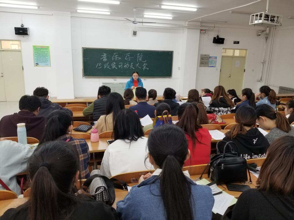 4月3日,2015级实习动员大会在博文楼108举行,音乐学院副院长马淑卿,声乐教研室主任刘平,实习带队老师冯春玲、刘禹彤、赵会峰以及15级音乐学专业全体学生参加此次会议,会议由器乐教研室主任刘晓飞主持。
