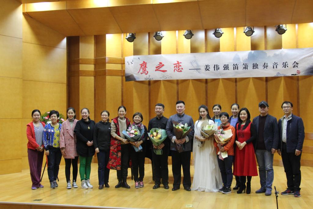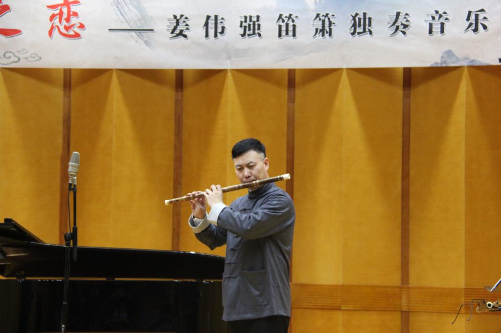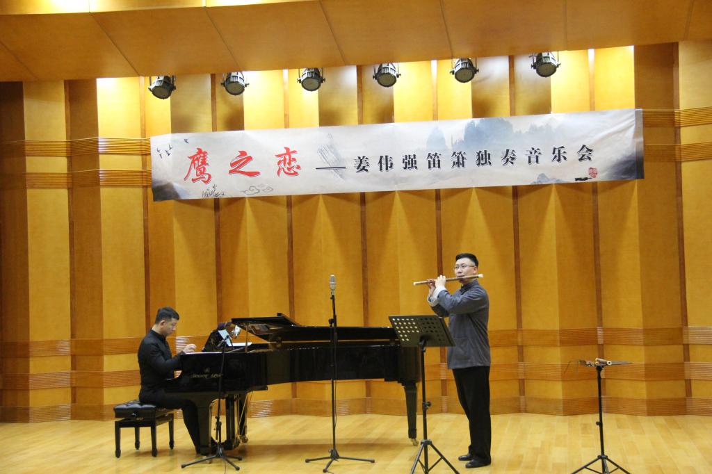 本场音乐会由我院姜伟强老师担任首席器乐演奏,姜伟强老师是我院音乐学院副教授,莫斯科师范大学博士,曾多次在国内外专业大赛夺魁。整场演出融合了独奏、合奏、协奏等多种表演形式,并特邀山东艺术学院青年教师唐宁和杜灿老师协奏助演。音乐会以一首钢琴、笛子合奏《走西口》拉开序幕,随后是笛子独白《冷月》,萧筝合奏《妆台秋思》等,以脍炙人口的民族曲调和流行元素展现了民族乐器的技巧与多样性,最后笛子协奏曲《鹰之恋》用带有西域特色的音乐语言,生动描绘了雄鹰矫健的身形、坚韧的性格和博大的胸怀,把音乐会推向了新的高潮。整场音乐会共演奏了八首乐曲,细腻生动的演奏,将笛萧之美流畅灵透地呈现在观众面前,赢得了全场喝彩。