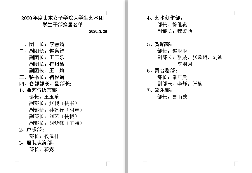 3月26日下午,山东女子学院大学生艺术团学生干部换届暨2020年度工作部署会议在腾讯会议(线上)顺利举办。大学生艺术团团长、音乐学院院长宋小霞、音乐学院党总支书记刘凤华、艺术团常务副团长田巍巍、秘书长李金叡以及艺术团学生干部出席本次会议。会议由大学生艺术团常务副团长田巍巍主持。