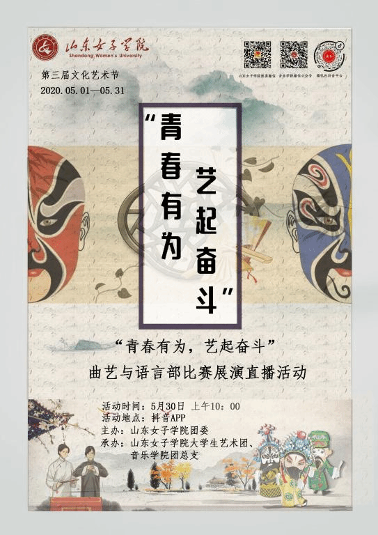 由校团委主办,山东女子学院大学生艺术团和音乐学院团总支承办的第三届文化艺术节系列活动之“青春有为,艺起奋斗”声乐、器乐、舞蹈、曲艺与语言部大赛优秀作品“云展演”,于5月30日—6月2日在抖音、全民K歌等平台上直播进行,现场直播效果良好,引起校内外同学、朋友的广泛关注。