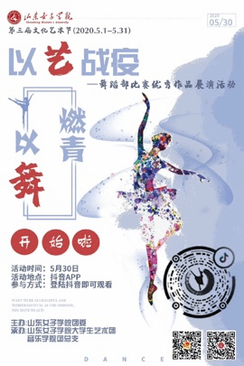 山东女子学院大学生艺术团“青春有为、艺起奋斗”声乐、器乐、舞蹈、曲艺系列比赛历时三十天,同学们积极报名参加、认真录制,共收到参赛作品200余项,覆盖全校12个院部,经过激烈角逐和评审团队的专业评审打分,共角逐出百余项作品参加此次“云展演”。此次活动紧跟新媒体时代潮流,利用抖音、全民K歌等前沿新媒体平台进行优秀作品“云展演”,展出方式新颖,展出作品风格丰富。展演活动在丰富学生活动,传播正能量的同时,为同学们提供了一个展现自己的舞台,为漫长的寒假生活留下了美好难忘的记忆,本次展演活动体现了同学们良好的艺术素养,彰显了女院大学生的青春风采,更是体现了疫情期间大学生敢于突破、勇于创新、积极向上的精神风貌。