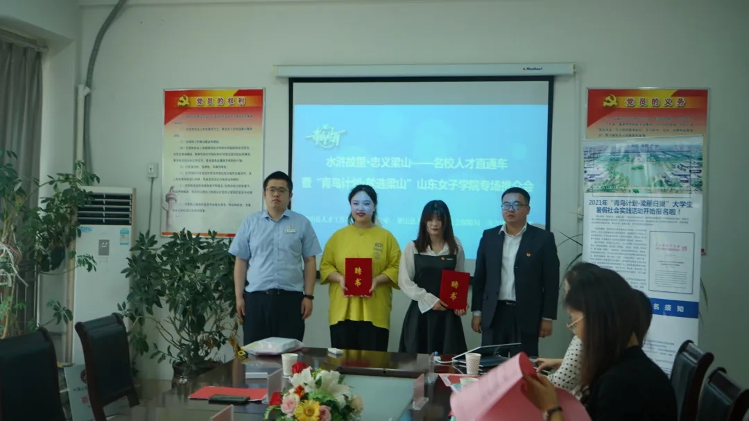 会议首先由李梅华老师介绍我院“青鸟计划·梁雁归巢”大学生社会实践基地工作的开展情况及未来工作展望。随后梁山县团县委副书记杜晗对梁山县基本情况、“青鸟计划·梁雁归巢”活动进行了详细介绍。梁山团县委挂职副书记李尚宾讲解了金融系统在2021年暑假中金融系统志愿者岗位招募的情况。音乐学院党总支书记刘凤华表示此次活动的开展得到校团委和梁山团县委的大力支持,学院将着力打造“青鸟驿站·梁雁归巢”大学生社会实践基地的建设,组织同学们在暑假期间多多参与社会实践活动,使大家进一步了解社会、参与社会,为家乡建设多做贡献,我院将与梁山团县委共同打造大学生社会实践亮点品牌项目。山东女子学院团委书记苏婧对梁山团县委同志的到来表示感谢,下一步学校团委充分利用青鸟计划这根红线,协调学校、联系家乡、组织学生三点共同发力把好“招才引智”工作大局,学校共青团将会对“青鸟计划·梁雁归巢”活动大力支持,认真细致做好该项工作。最后,梁山团县委杜晗书记和李尚宾书记为我院青鸟驿站站长聂利亚、副站长宋婷婷颁发聘书。