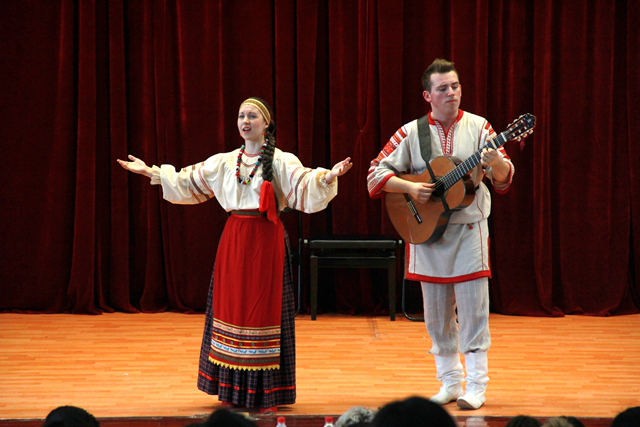 下午,来自俄罗斯的师生们载歌载舞,倾情表演,为现场的观众带来了一首首经典的俄罗斯地方民歌。《无边的草原》、《白雪》、《水灵灵的姑娘》、《卷心菜、卷心菜》,歌曲涵盖了从古俄罗斯前基督教民俗音乐到18—19世纪俄罗斯的哥萨克民歌、宗教诗歌、集体舞和民族歌舞等。热烈、欢快的韵律,浓郁的俄罗斯民族风情感染了在场的每一位观众,现场不时爆发出热烈的掌声。演出在一组怀旧的苏联歌曲串烧中落下帷幕。