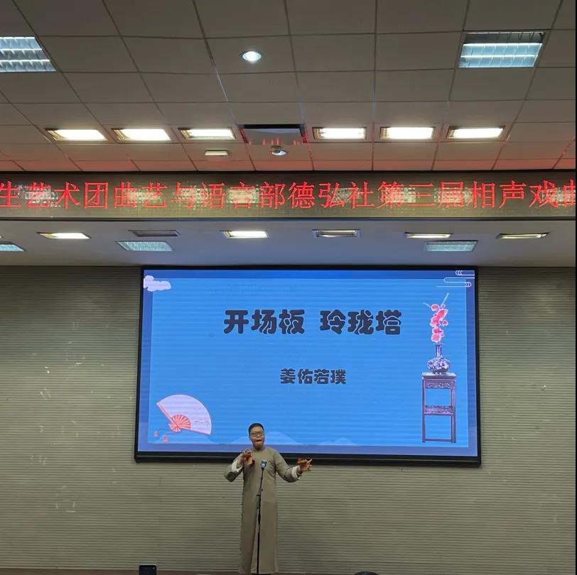 为丰富校园文化生活,更好地弘扬和传承中华优秀传统文化,大学生艺术团曲艺与语言部德弘社于2021年11月18日晚6点在图书馆一楼报告厅举行了第三届相声戏曲专场。