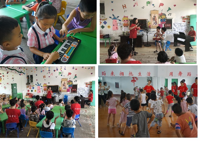 幼儿园的支教活动内容丰富,队员们向幼儿园赠送了小乐器和学习用具,教给小朋友们基础的音乐知识、唱好听的歌,认识了八音琴、牛皮小鼓、迷你电子琴等小乐器并学会了简单的演奏,学习优美的舞蹈动作、编排舞蹈小节目,和小朋友们一起做游戏等等。晚上还到广场教当地群众跳广场舞,群众参与的积极性非常高。