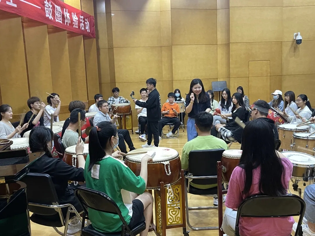 活动中,由傅娆老师带领参与者围成圆圈,按照热身练习、团体互动、即兴演奏、再创音乐这四个步骤进行有规律的、有配合的打击乐器演奏。通过触觉、视觉、听觉、感觉、运动觉等多方面的细微变化,感受当下内心的真实自我。在傅老师的指挥下音乐厅中所有的鼓、铃、沙锤同时演奏,极具感染力的节奏与富有变化的鼓声让同学们放松身心,在有节奏的打击乐中传递力量和温暖。
