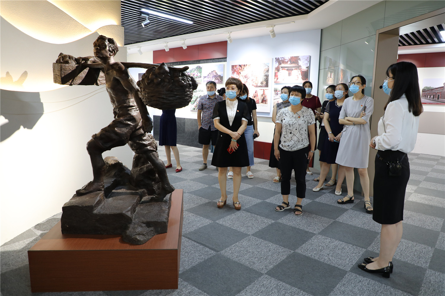 来到五楼,大家参观了"泰山——中华民族的精神家园"展。一座古铜色的雕塑格外引人注目,雕塑展现了一个脚登台阶、肩挑重担、目光坚定的泰山挑山工形象。大家通过"挑山工抬大架"的故事,深刻感悟新时代泰山“挑山工”“挑担不畏难、登山不畏险、坦途不歇脚、重压不歇肩”的优秀品格。