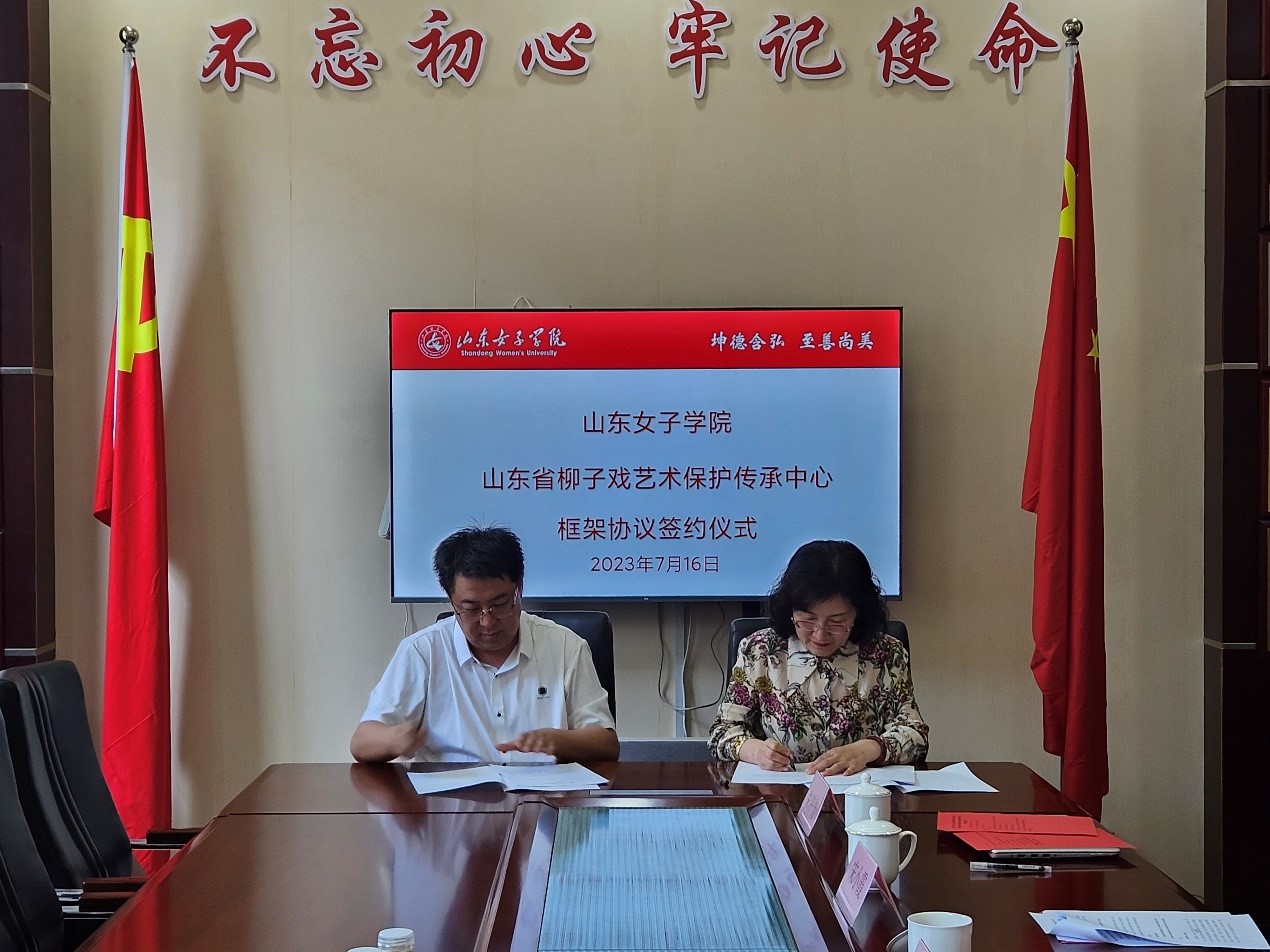 山东女子学院音乐学院院长宋小霞主持签约仪式。首先,李贝书记、刘恩允副校长分别介绍了双方的基本情况和合作的具体内容。接下来,刘校长和李书记签署了山东女子学院与山东省柳子戏艺术保护传承中心战略合作协议。双方就共建传承教育实践基地、共建教学实践平台、共同开展科研合作三个方面达成合作共识。