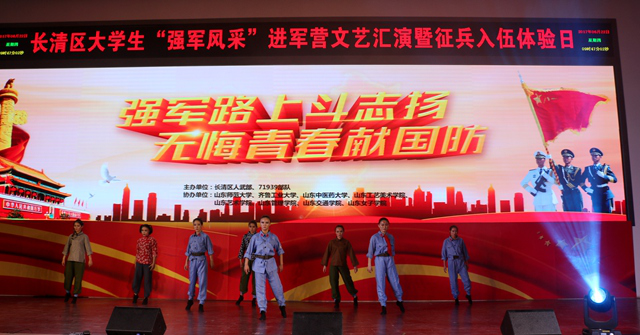 6月23日上午,由长清区武装部和驻长清某部队联合举办的以“强军路上斗志扬•无悔青春献国防”为主题的进军营文艺汇演暨征兵入伍体验日活动在驻长清某部队举行。参加本次活动的有部队领导、各高校代表以及官兵战士和学生代表。本次文艺汇演共有6所高校和某部队选送的13个节目,其中包括我院选送的《唱支山歌给党听》、《八女投江》、《千丝万缕一片情》三个节目。